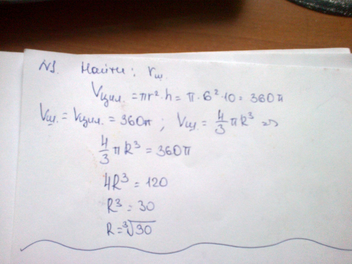 Найдите радиус шара ,объем которого равен объему цилиндра с высотой 10 см и радиусом 6 см.