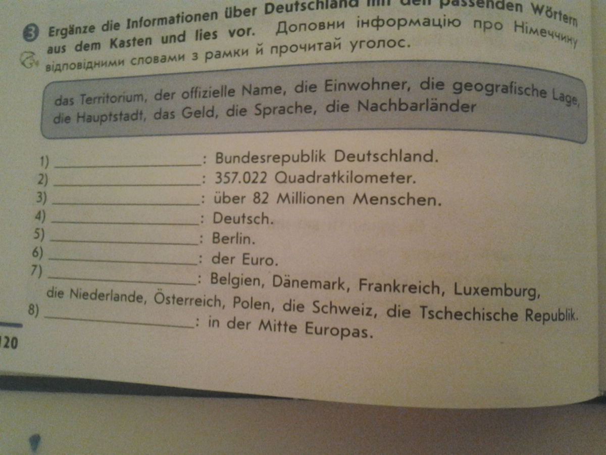 1)der offizielle Name; 2)das Territorium ; 3) die Einwohner; 4) die Sprache; 5)die Hauptstadt; 6)das Geld; 7) die Nachberla"nder; 8)die geografische Lage; (" это точки над А как в списке слов); перевод. 1) официальное название Федеративная Республика Германия; 2)территория 357,022км квадратеых; 3) жителей более 82млн человек; 4)язык немецкий; 5) столица Берлин; 6) деньги Евро; 7) соседи страны Бельгия, Дания, Франция, Люксембург, Нидерланды, Австрия , Польша, Чехословакия Республика, Швейцария. 8) географическое положение (середина ) центр Европы