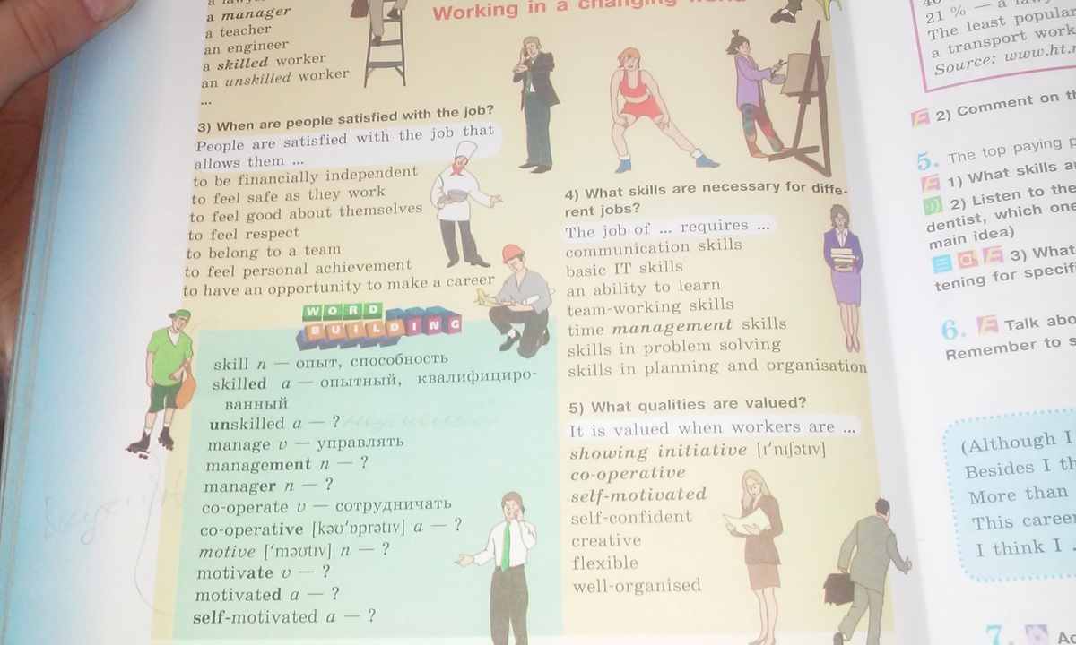 4) All jobs require necessary skills. I think, for example, the job of manager requires communication skills and, of course, team-working and time management skills. The job of a teacher is even harder and requires skills in problem solving, in planning and organisation and communication skills as well.