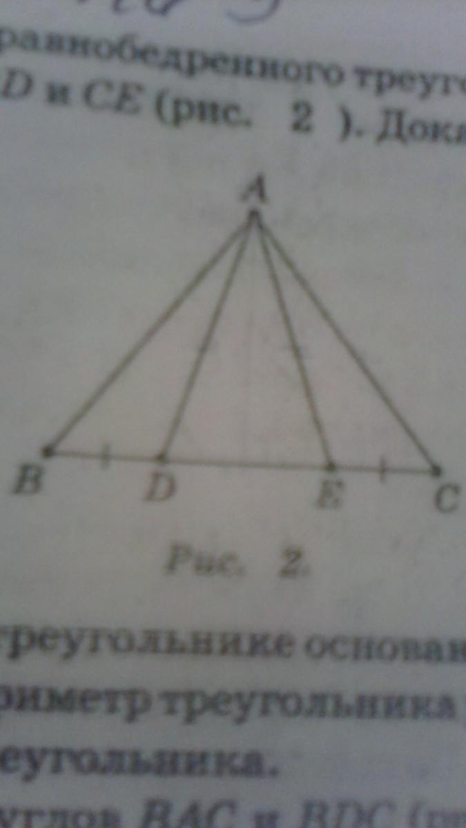 На основании BC равнобедренного треугольника ABC отложены равные отрезки BD и CE.Докажите,что AD=AE.(рис. 2)