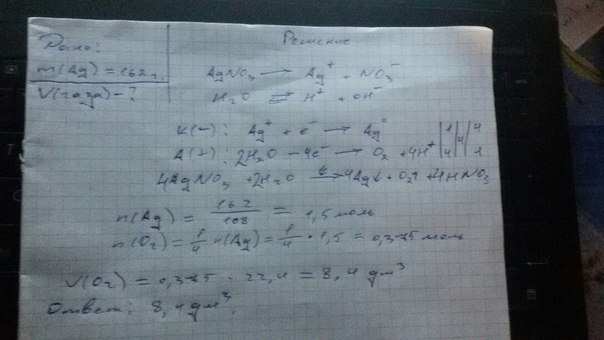 При электролизе раствора нитрата серебра на катоде получили 162г серебра. Составьте схему электролиза, определите объём (н.у.), выделившегося на аноде газа.