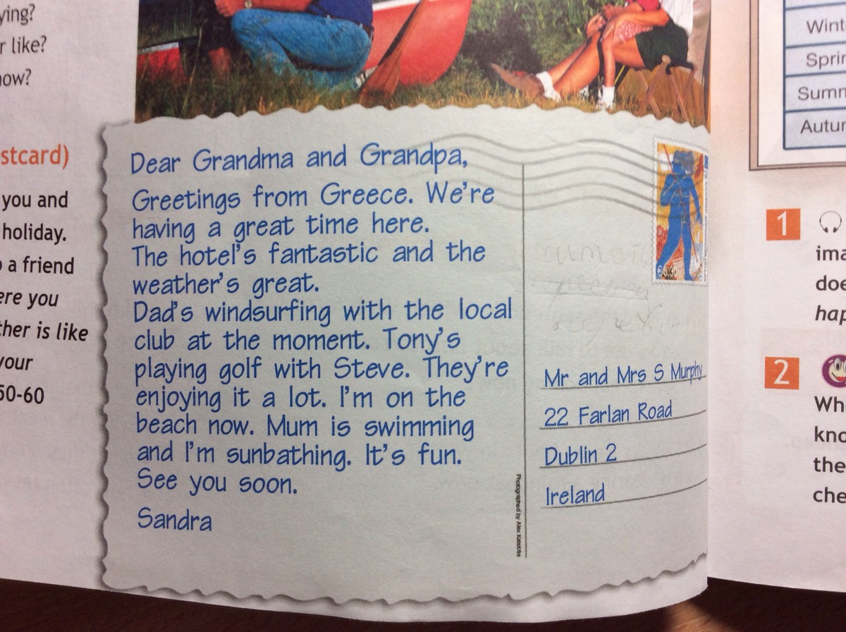 Дорогие бабушка и дедушка, привет из Греции! Мы здесь отлично проводим время. Отель фантастический и погода отличная. Отец занимается виндсерфингом в местном клубе на данный момент. Тони играет в гольф со Стивом. Им очень весело.Я сейчас на пляже. Мама плавает, а я загораю. Это весело.