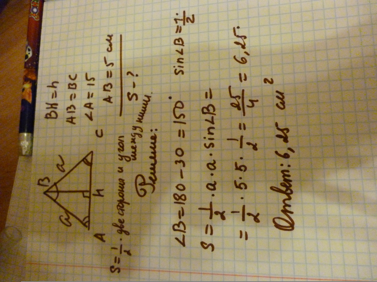 Найдите площадь равнобедренного треугольника с углом при основании 15 градусов и боковой стороной равной 5см.