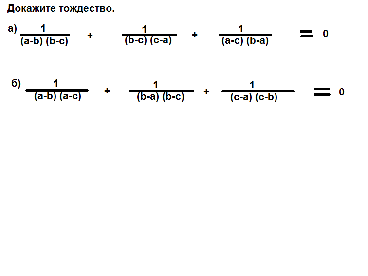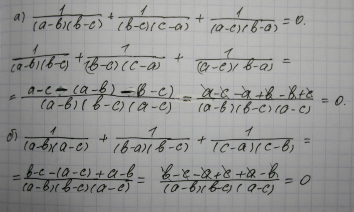 a)1/(a-b)(b-c)+1/(b-c)(c-a)-1/(c-a)(a-b)=0