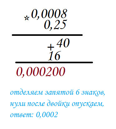 В произведении должно быть столько цифр после запятой, сколько их всего после запятой во множителях ( 2цифры в 1-ом множителе + 4цифры во 2-ом множителе = 6) Отделяем 6цифр после запятой, получаем 0,000800.