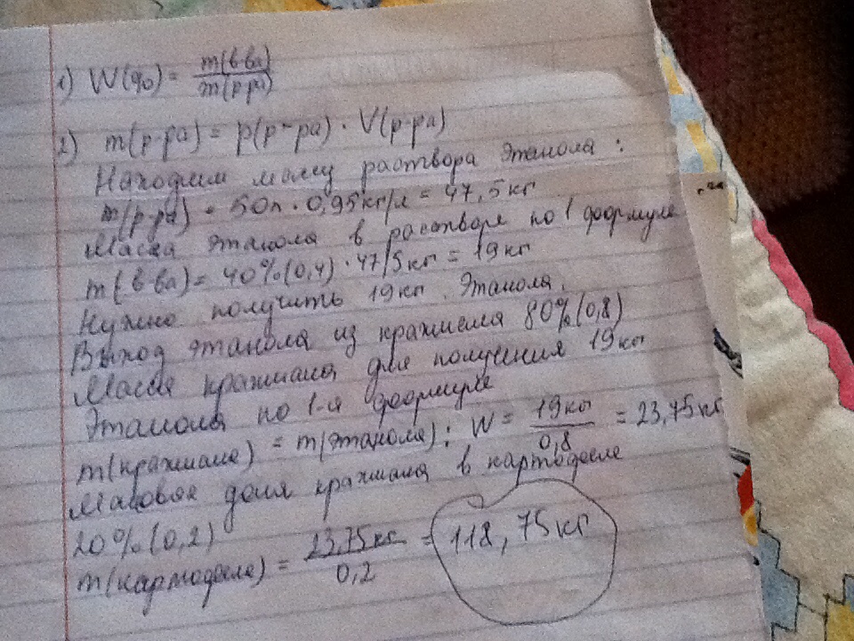 СРОЧНО!!!СЕЙЧАС!Какую массу картофеля (кг) нужно взять для получения 50л р-ра этанола с мас-вой долей С2Н5ОН 40%? Выход этанола 80%, массовая доля крахмала в картофеле 20%, плотность р-ра - 0, 95кг\л.