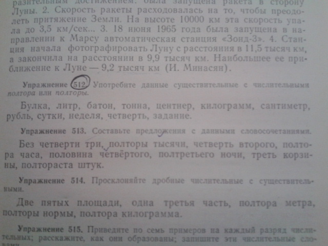 512. Полторы булки, полтора литра, полтора батона, полторы тонны, полтора центнера, полтора килограмма, полтора сантиметра, полтора рубля, полторы суток, полторы недели, полторы четверти, полтора задания.