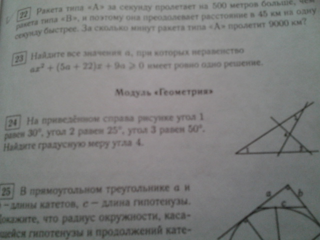 На проведенном справа рисунке угол 1 равен 30°, угол 2 равен 25°, угол 3 равен 50°. Найдите градусную меру угла 4