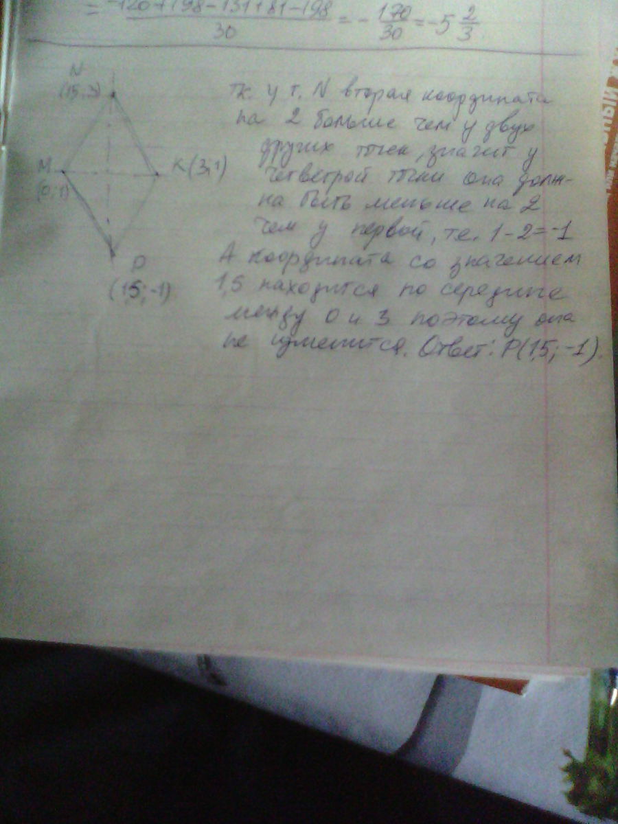 СРОЧНО! Даны координаты трех вершин параллелограмма; М (0;1), N (1,5;3), К (3;1). Какие координаты может иметь четвертая вершина этого параллелограмма?