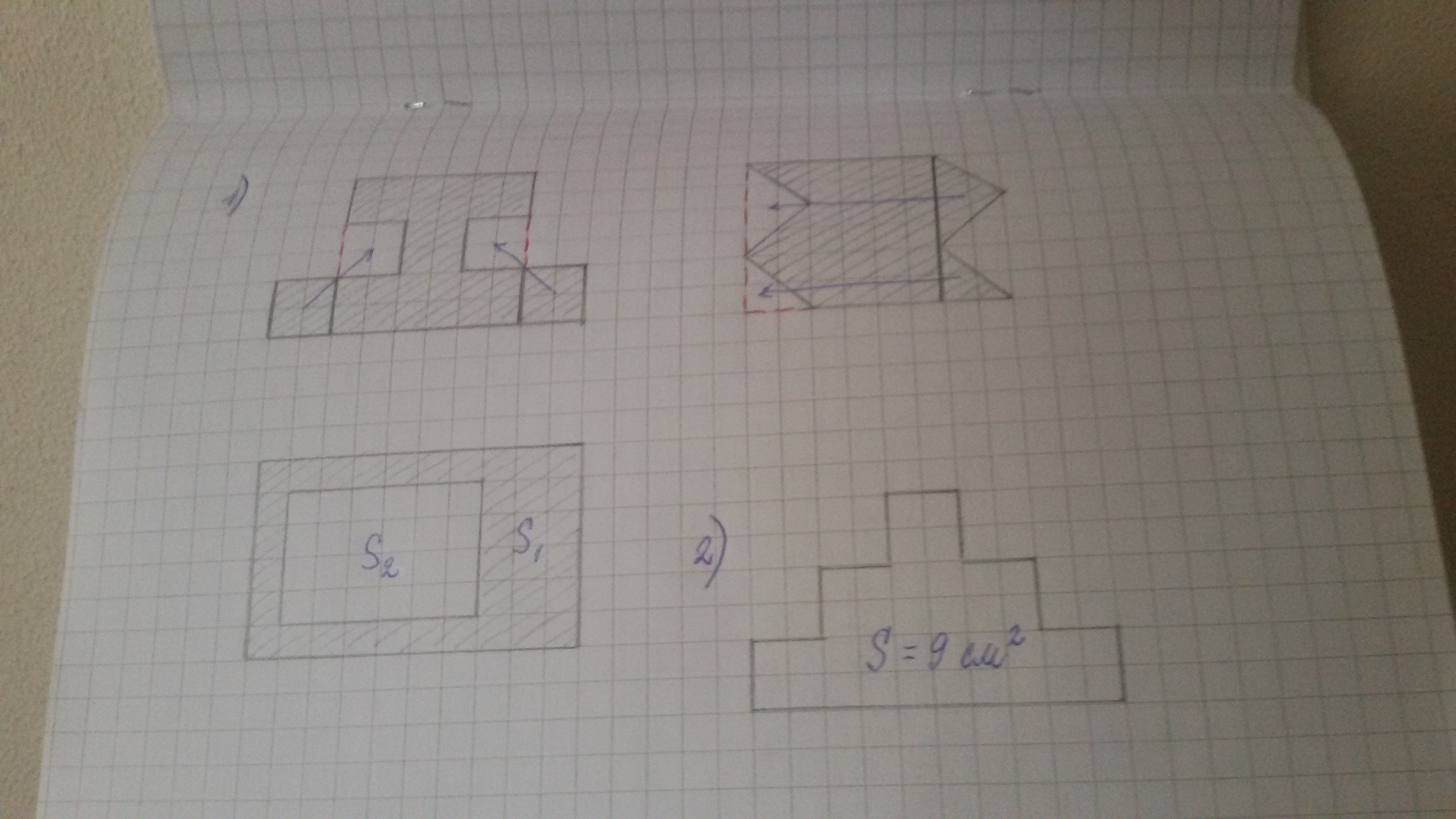 2) Как мы видим, площадь всех трёх фигур одинаковая. Можно начертить прямоугольники со сторонами 1 см и 9 см; 3 см и 3 см. Площадь будет равна 9 см².