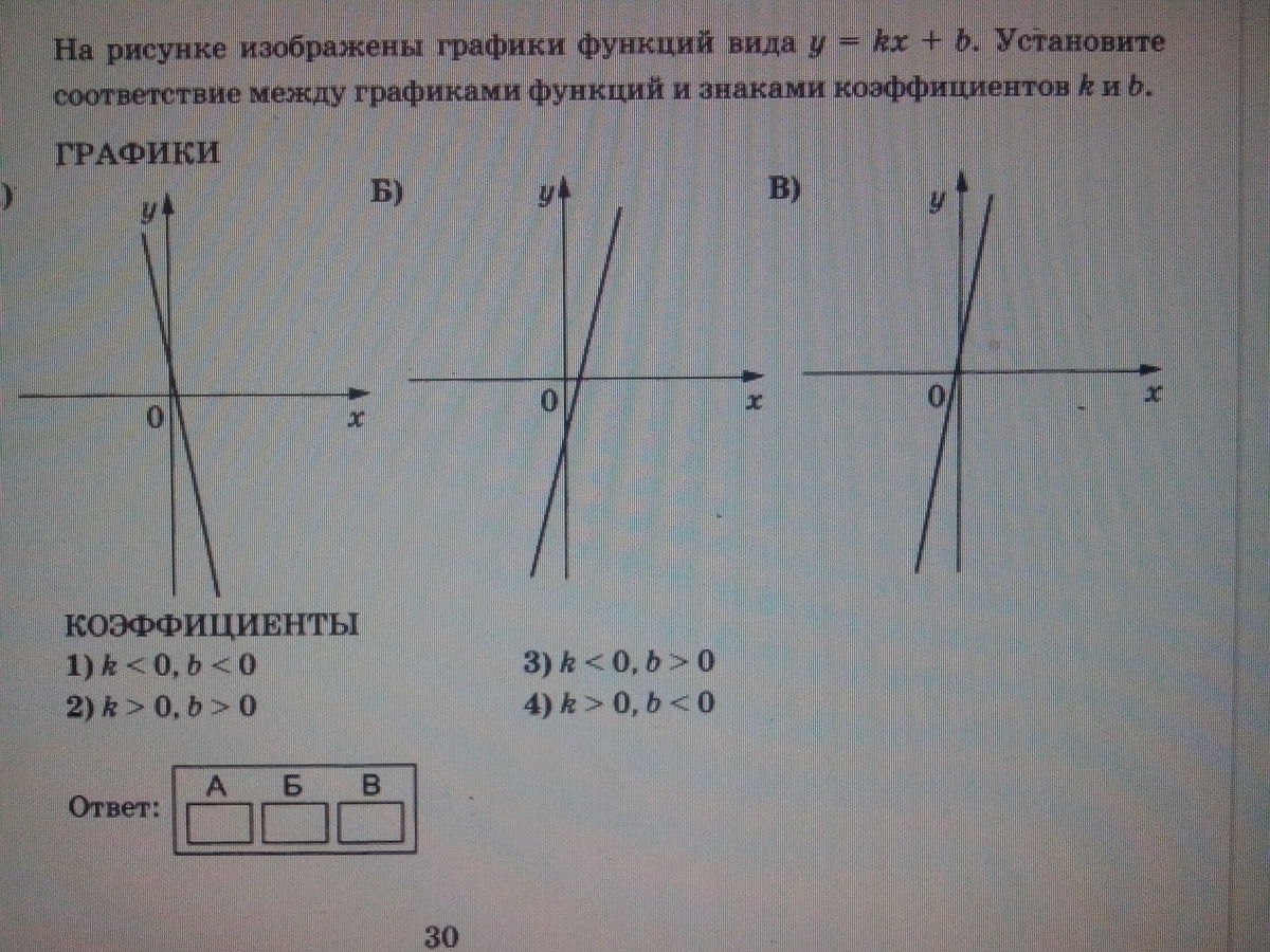 А-3;Б-4; В-2. k- это угловой коэффициент линейной функции, он определяет тангенс угла, образованного осью абцисс(осью Х) и прямой. Если к>0, то образованный угол острый, если к<0, то угол тупой. Угол отсчитывается от положительного направления оси х. Коэффициент b - это точка пересечения с осью ординат(ось У).