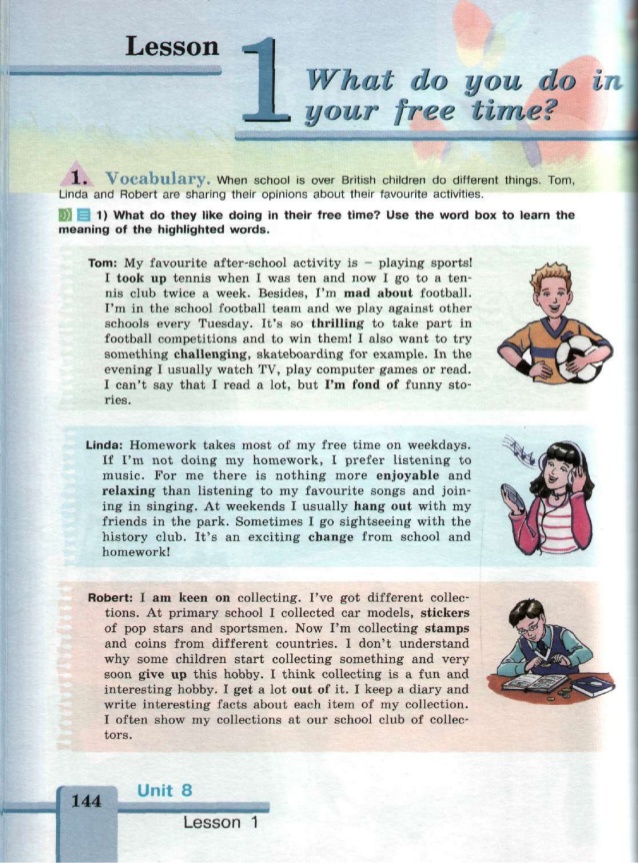 Роберт: Я увлекаюсь коллекционированием. У меня много разных коллекций. В начальной школе я коллекционировал модели машин, плакаты с поп-звёздами и спортсменами. Сейчас, я коллекционирую марки и монеты различных стран. Я не понимаю, почему некоторые дети когда начинают что-то коллекционировать, вскоре, бросают это хобби. Я считаю что, коллекционирование - это забавное и интересное хобби. Я многое извлекаю из этого. Я храню дневник, где записываю интересные факты о каждом из предметов в моей коллекции. Я часто показываю свои коллекции в нашем школьном клубе коллекционеров.