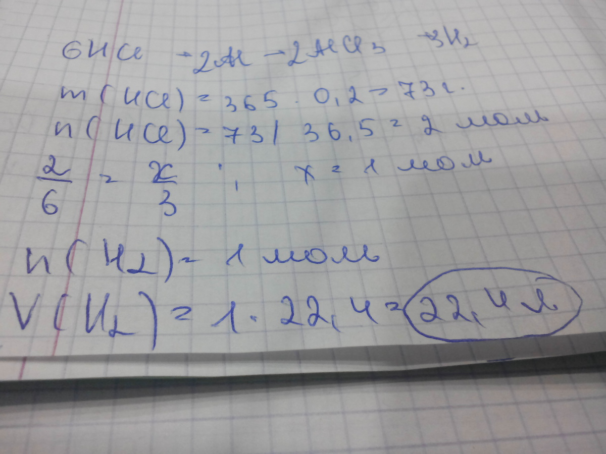 Вычислите объем водорода (н.у.), который можно получить при действии 365 г 20%-ного