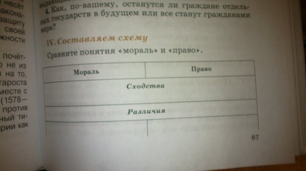 Сходства: 1. Мораль и право являются неким стандартом поведения человека. 2.В любом случае за не соблюдение норм следует неодобрение (хотя тут можно поспорить).