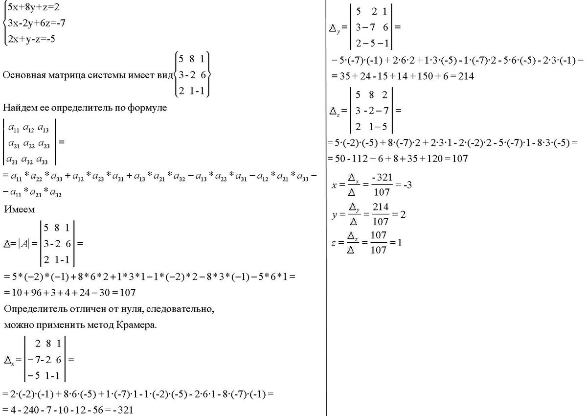Сначала находм основной определитель, т. е. без столбца свободных членов, получаем = 8