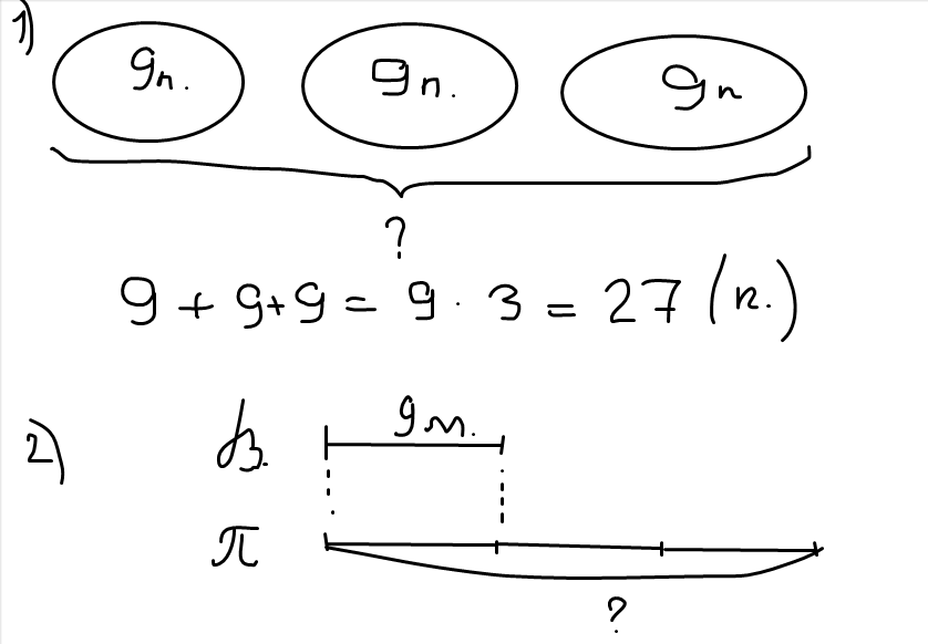 2) У Васи было 9 марок с изображением Москвы, а у Пети в 3 раза больше. Сколько марок было у Пети? (объяснение решения: увеличили в несколько раз -это действие умножение)
