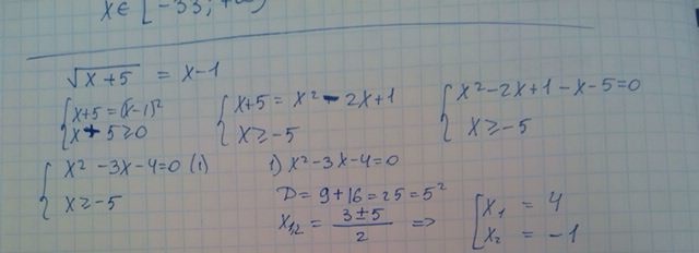 (х+5)=(х-1)^2 при х> -5 Решаем квадратное уравнение х^2-2x+1-x-5=0