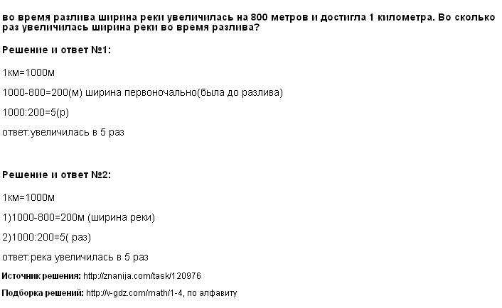 Во время разлива ширина реки увеличилась на 800 м и достигла 1 км. Во сколько раз увеличилась ширина во время разлива?