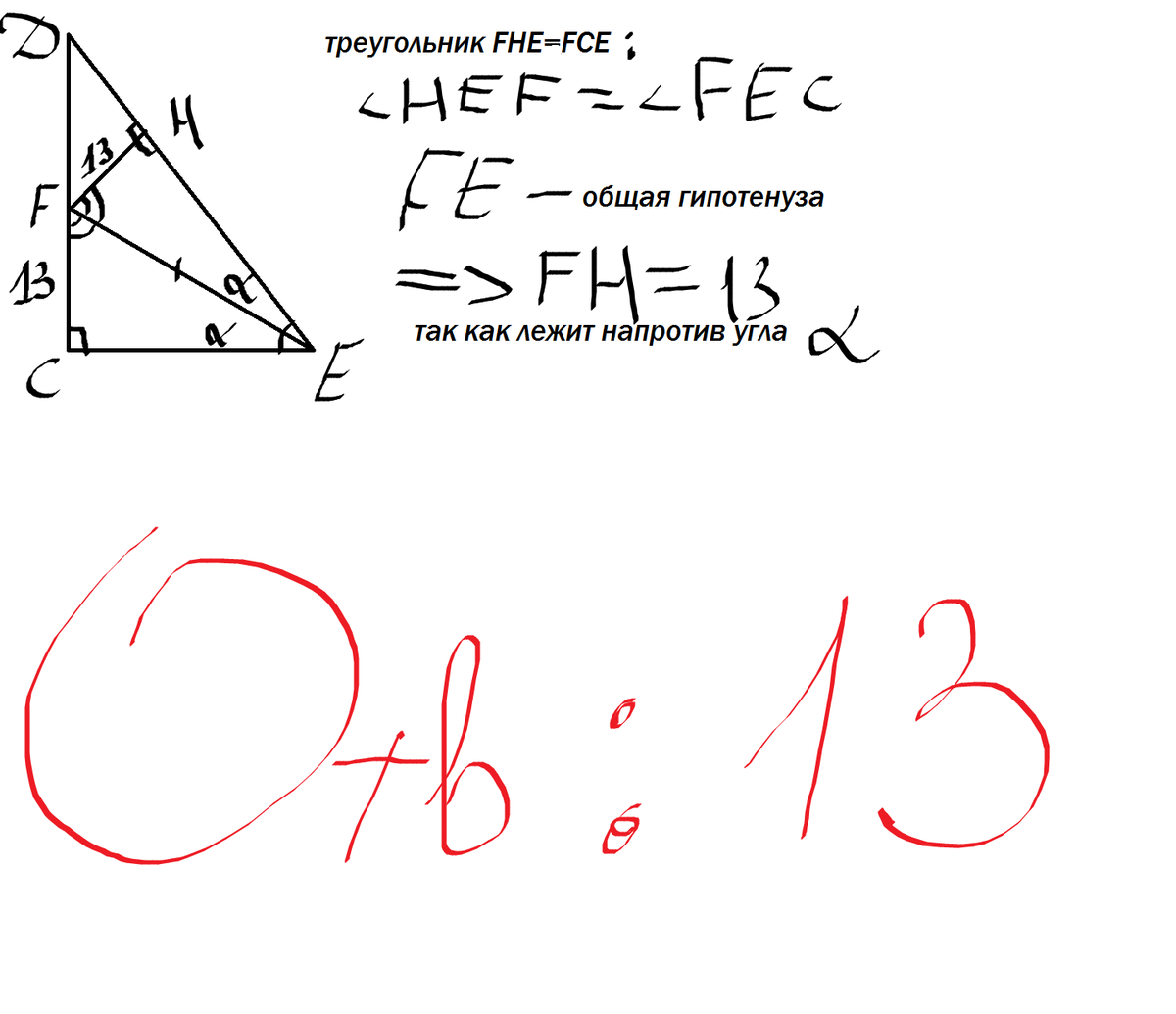 В прямоугольном треугольнике DCE с прямым углом C проведена биссиктриса EF ПРИЧЁМ FC =13см найдете расстояние от F до прямой DE