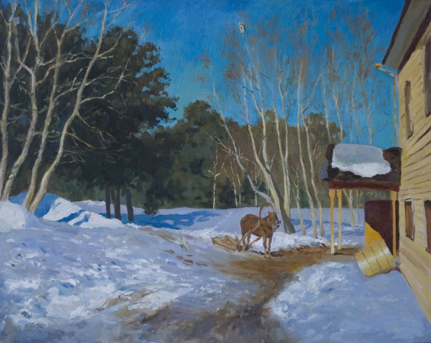 Перед нами картина известнейшего русского пейзажиста Исаака Левитана – «Март». Глядя на это полотно, несомненно, мы проникаемся тем настроением, которое нам хотел передать художник. Картина проникнута чувством ожидания и томления. Об этом говорит и смиренная лошадь с санями, одиноко стоящая неподалёку дома, которая ждёт своего хозяина. Озарённая солнцем, она, очевидно, задремала от тепла ласкающих нежных весенних лучей. На переднем плане мы видим крыльцо и короткую желтую стену дома. Жёлтый цвет придаёт картине больше тепла и солнечного света. На шапке крыльца лежит снег, но создаётся такое впечатление, что снег – тёплый, ведь он озарён яркими солнечными лучами! Скоро по железному стоку зазвенит капель! Дверь дома открыта, с минуты на минуту выйдет хозяин, которого так заждалась лошадка, и отправится в путь. Но главное, что нас привлекает в этой картине – это ожидающая весну природа. Небо безупречного голубого цвета говорит нам о том, что метелей не предвидится. Неужели пришла весна? Подтаявшая дорога и несброшенная осенняя листва на деревьях ждут перемен. Всё ожидает прихода нового тёплого сезона! Природа нежится в тёплых солнечных лучах. Слева перед нами предстаёт лес, ожидающий весну. Картина здесь разительно отличается. Хвойная зелень отбрасывает тёмные тени. Очевидно, что в лесу царит зимний холод, краски мрачные и тёмные. Солнечные мартовские лучи ещё не успели обогреть хмурые сине-зелёные ели, а так хочется, чтобы солнце ярко-золотым светом озарило их насупившиеся кроны! Скоро это произойдёт, ведь на дворе - март!