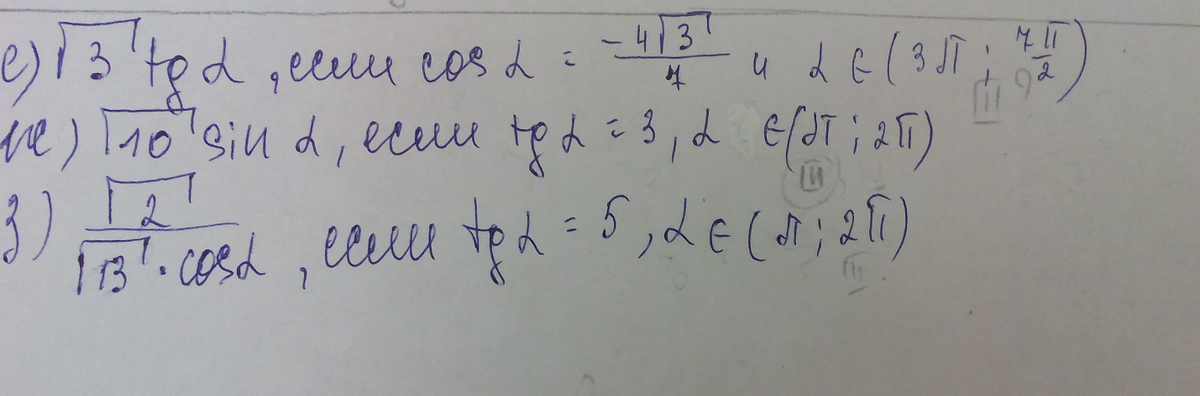 e) (sina)^2=1/49 sina=-1/7, корень из 3 *tga=- 1/4