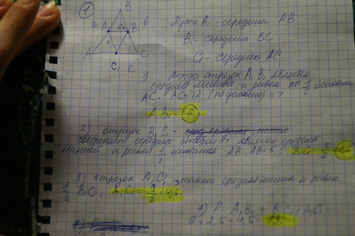 1)Точки А1,В1 и С1-середины сторон треугольнака АВС,в котором АВ=5см, ВС=9см и СА=12см..Найдите периметр треугольника А1В1С1.
