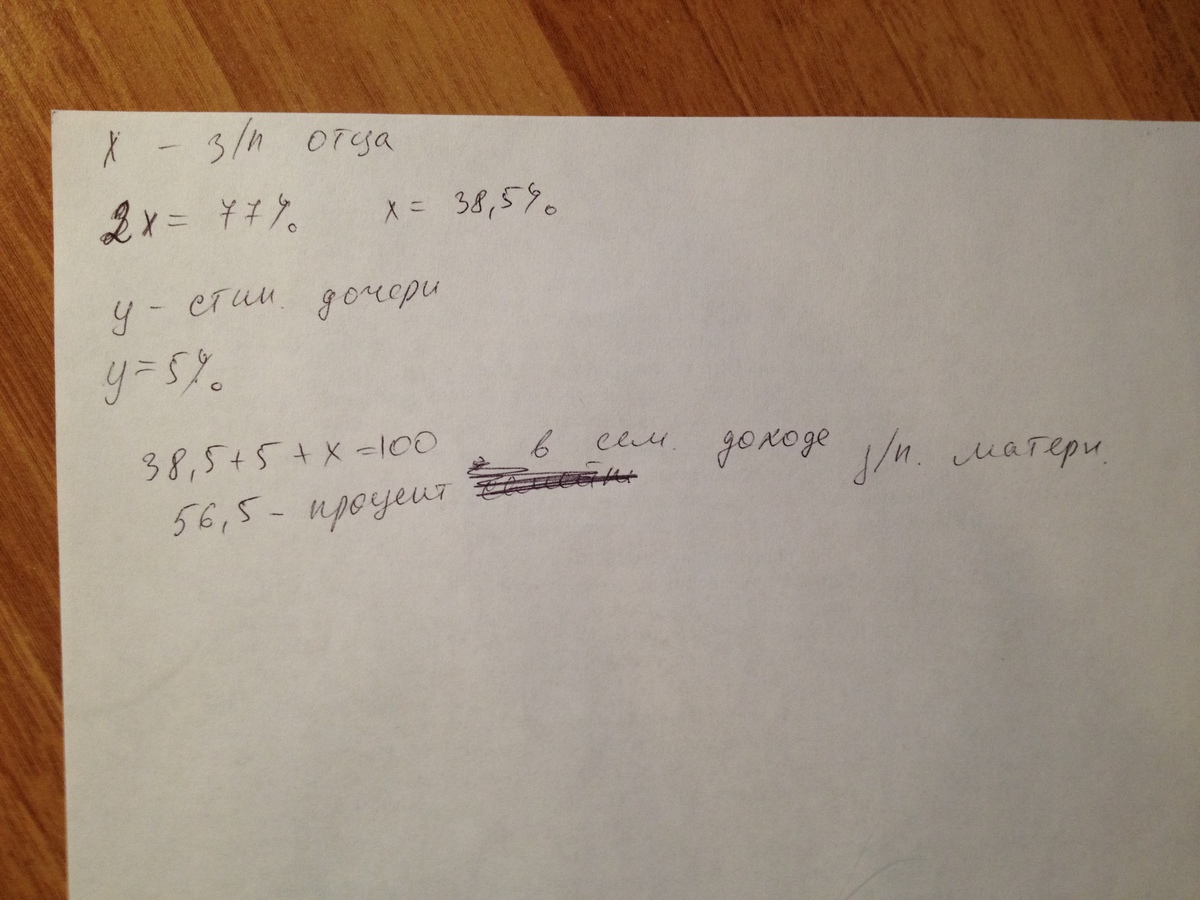 Семья состоит из 3 человек. Если зарплату отца увеличить в три раза, то семейный доход увеличится на 77%. А если стипендию дочери уменьшить в два раза, то семейный доход уменьшить на 5%.Сколько процентов от семейного дохода составляет зарплата матери