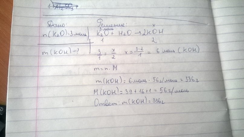 Какая масса калий гидроксида образуется при взаимодействии с водой калий оксида количеством 3 моль?
