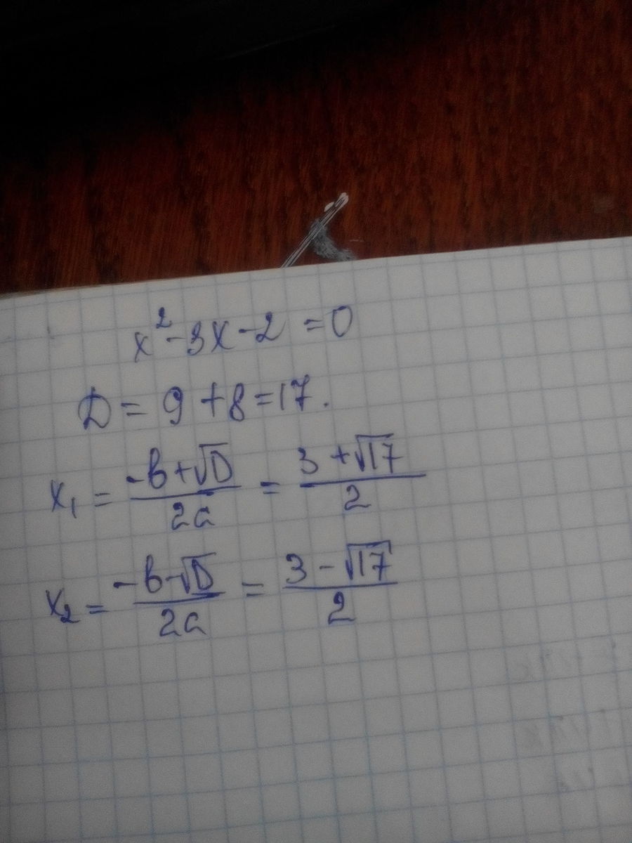 Д=(-3)^2-4*1*(-2)=9+8=17