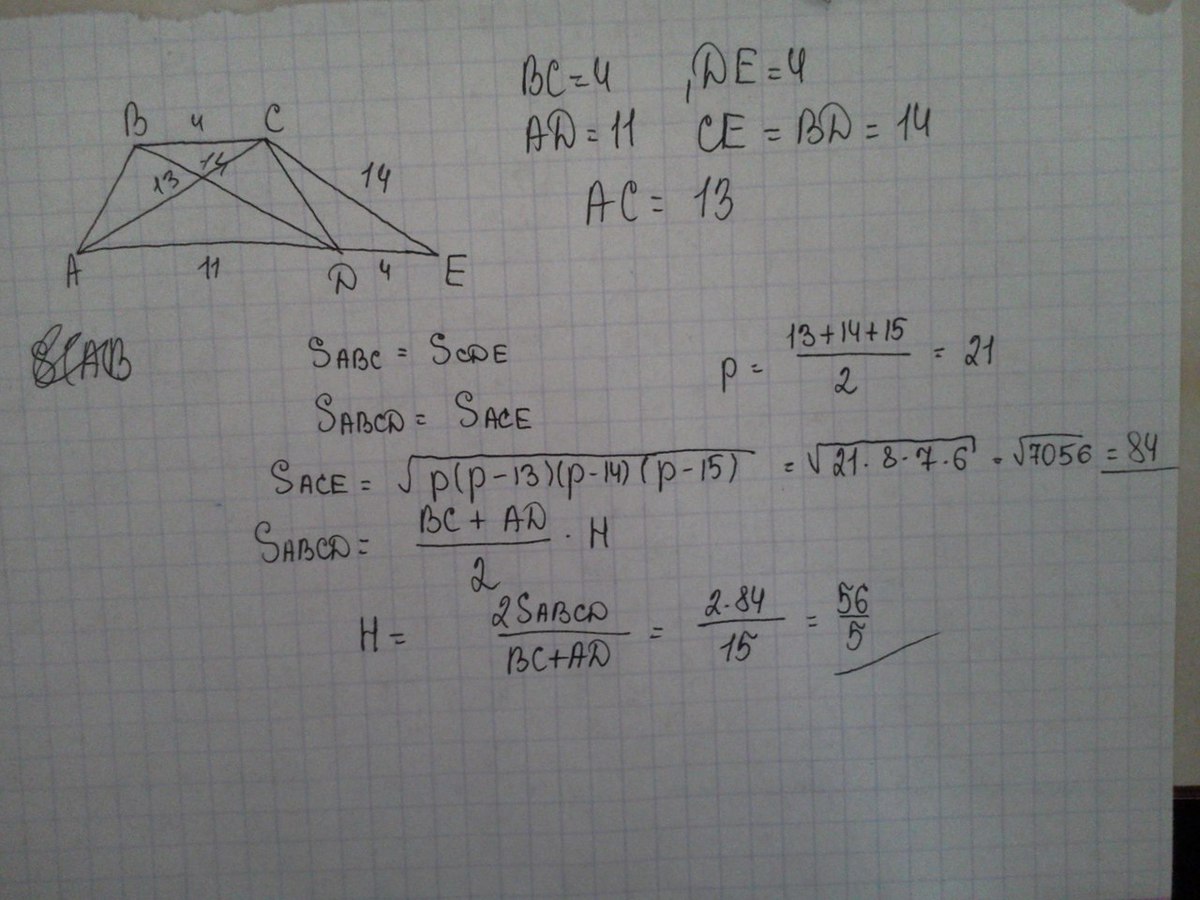 Помогите пожалуйста. В трапеции длины оснований равны 4 и 11, а длины диагоналей 14 и 13. Найдите высоту и площадь трапеции.