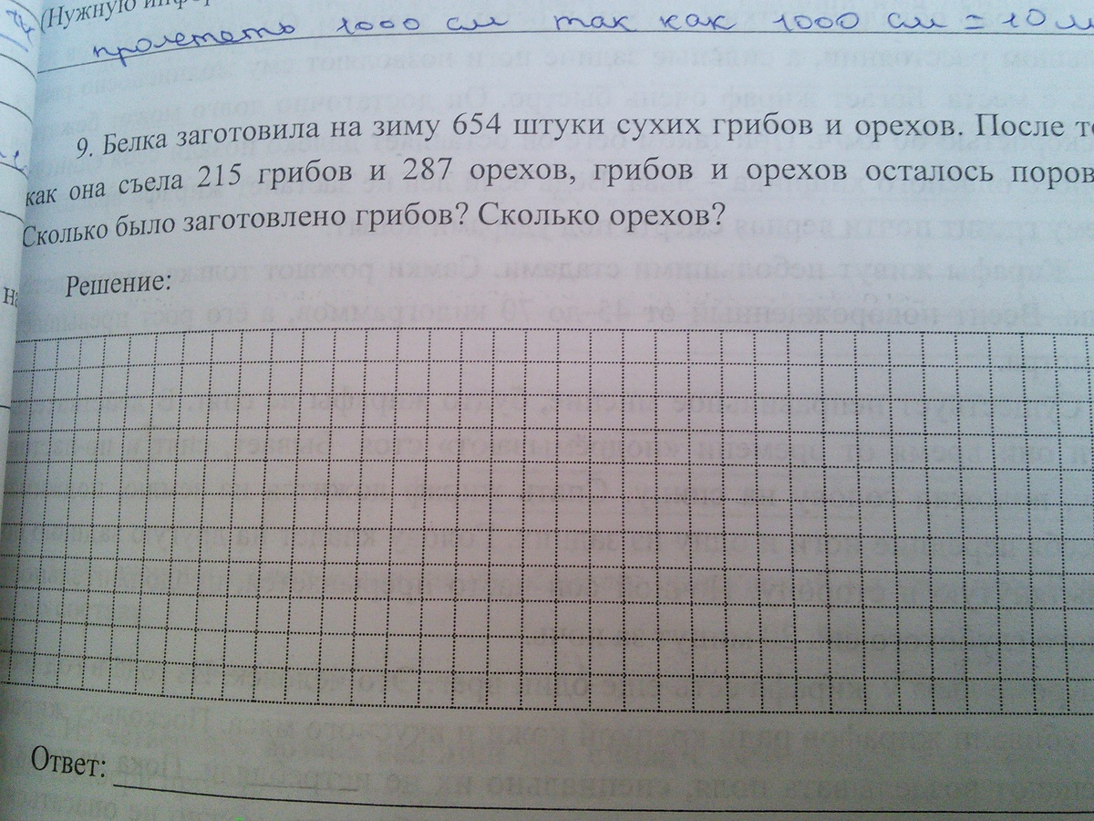 Белка заготовила на зиму 654 штуки сухих грибов и орехов после того как она съела 215 грибов и 287 орехов грибов и орехов осталось поровну сколько было заготовлено грибов сколько орехов