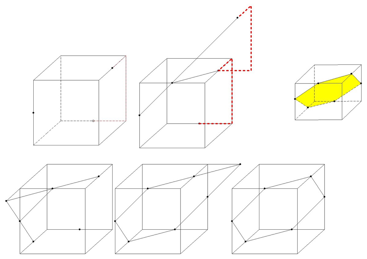 если эти ребра лежат на гранях, на которых есть известные точки, то от точек пересечения проводят прямые на эти точки