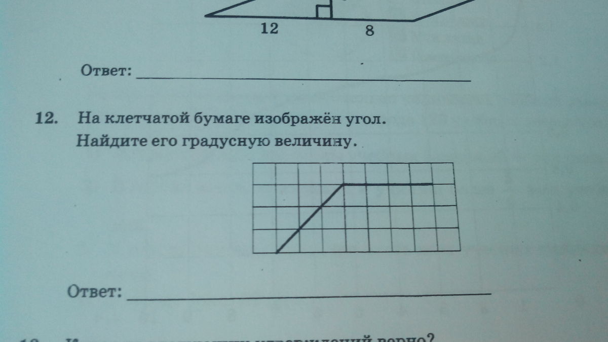 Сторона, проведённая вниз наискосок, проходит через углы квадратных клеточек так, что делит клеточку на два равных прямоугольных треугольничка, в которых острые углы все по 45 гр.