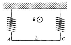 Прямолинейный проводящий стержень АС (см. рис.) длиной L = 0,5 м и массой 300 г подвешен горизонтально на двух одинаковых вертикальных пружинах в однородном магнитном поле В = 0,2 Тл. Вектор магнитной индукции