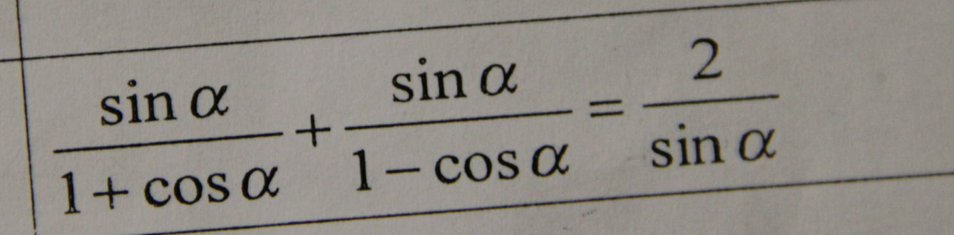 frac{sin a}{1+cos a}+frac{sin a}{1-cos a}=\ sin a*(frac{1}{1+cos a}+frac{1}{1-cos a})=\ sin a*(frac{1*(1-cos a)}{(1+cos a)(1- cos a)}+frac{1*(1+cos a)}{(1-cos a)(1+cos a)})=\ sin a*(frac{1-cos a}{1-cos^2 a}+frac{1+cos a}{1-cos^2 a})=\ sin a*(frac{1-cos a}{1-cos^2 a}+frac{1+cos a}{1-cos^2 a})=\ sin a*frac{1-cos a+1+cos a}{1-cos^2 a}=\ sin a*frac{1-cos a+1+cos a}{1-cos^2 a}=\ sin a*frac{2}{sin^2 a}=\ frac{2sin a}{sin^2 a}=frac{2}{sin a}
