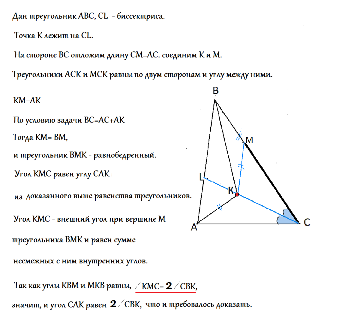 На биссектрисе CL треугольника ABC выбрана точка K. Оказалось, что AC+AK=CB. Докажите что угол CAK=2*уголCBK.