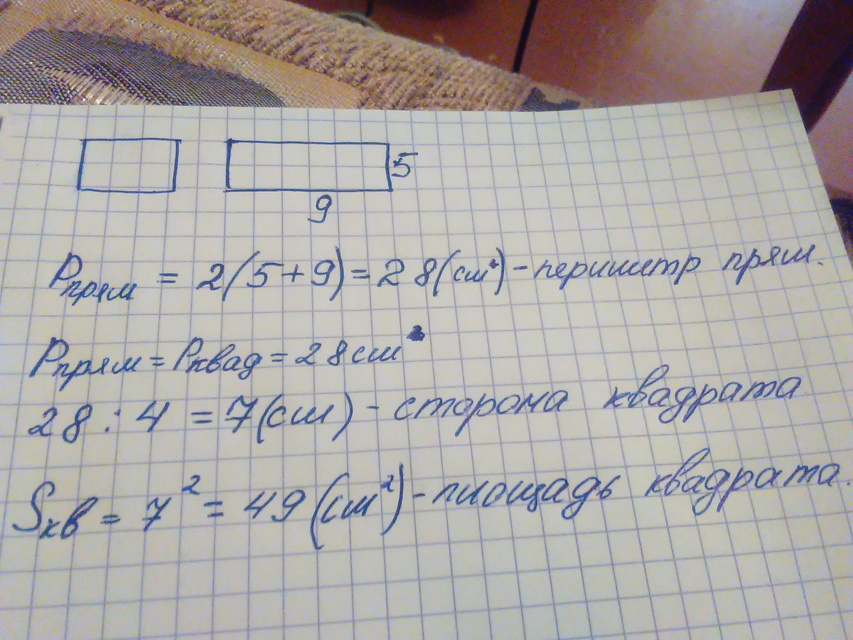 Прямоугольник и квадрат имеют одинаковые периметры. Чему равна площадь квадрата, если стороны прямоугольника - 5см, 9см?