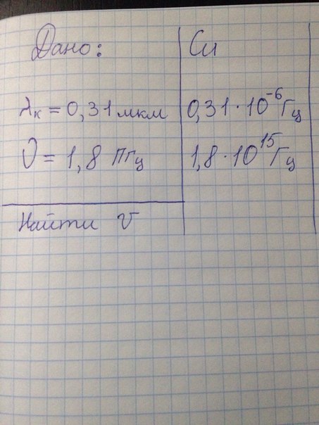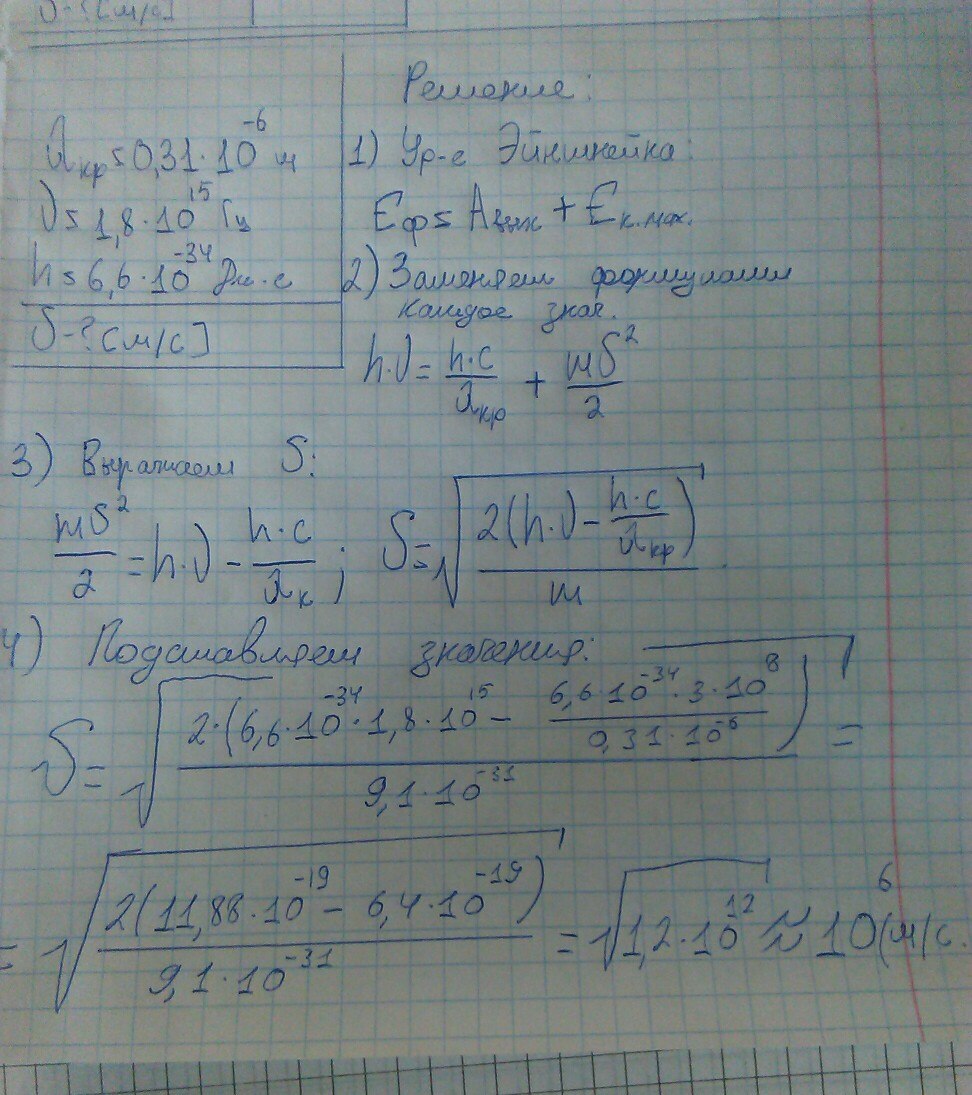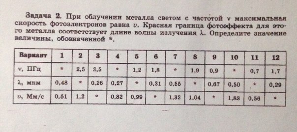 При облучении металла светом с частотой v максимальная скорость фотоэлектронов равна V. Красная граница фотоэффекта для этого металла соответствует длине волны излучения /\(лямбда). Вариант №6, нужно решение