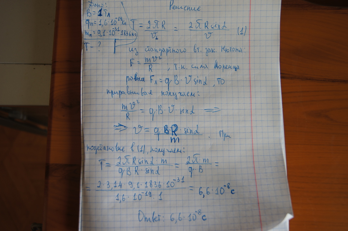 Протон движется по окружности в однородном магнитном поле , индукция которого 1 Тл . Вычислить период обращения протона.