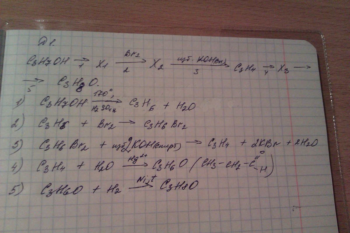 C3H7OH---X1---(Br2)X2---(изб.KOH спирт.)С3H4---X3---С3H8O