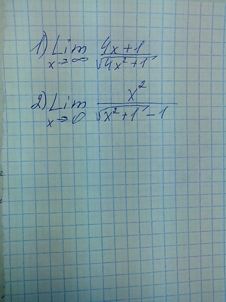 1) Lim(4x+1)/sqrt(4x²+1) = lim(4x+1)/(2x*sqrt(1+1/(4x²)) =lim(4+1/x)/(2*sqrt(1+1/(4x²)) =