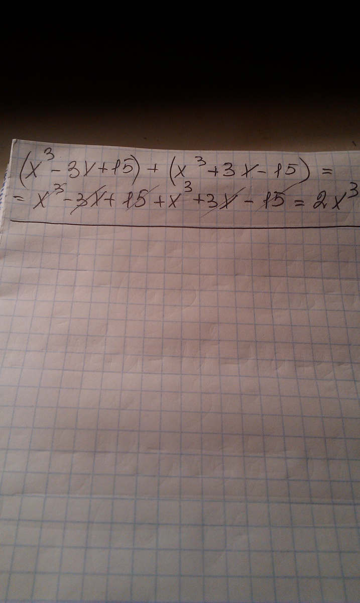х^3 -3х+15 +(х^3+3х-15) = х^3 -3х+15 + х^3+3х-15 = 2*x^3