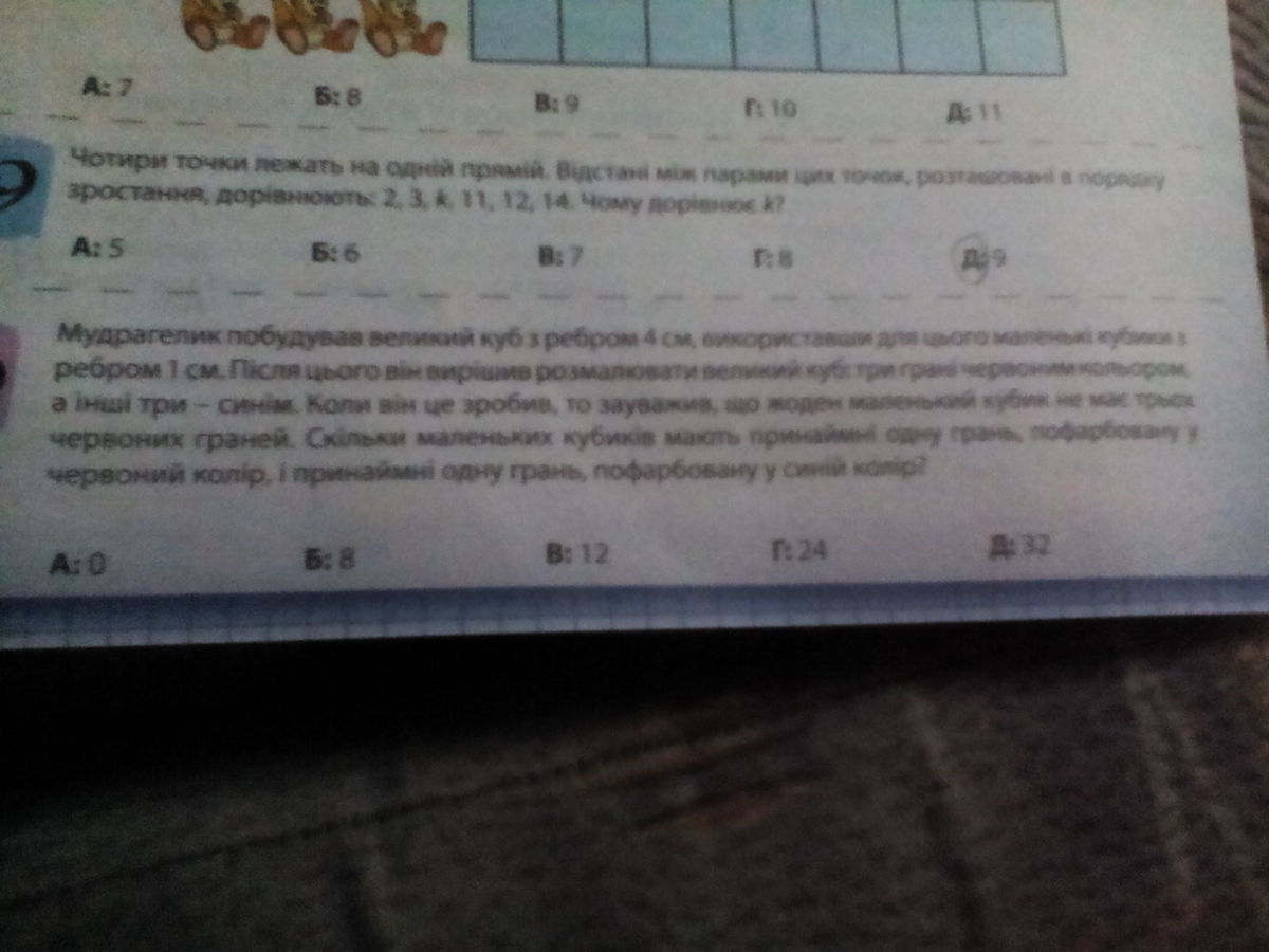 Мудрагелик побудував великий куб з ребром 4 см, використавши для цього маленькі кубики з ребром 1 см. Після цього він вирішив розмалювати великий куб: три грані червоним кольором, а інші три - синім. Коли він це зробив, то зауважив, що жоден маленький кубик не має трьох червоних граней. Скільки малкньких кубиків мають принаймні одну грань, пофарбовану у червоний колір , і принаймні одну грань, пофарбовану у синій колір?