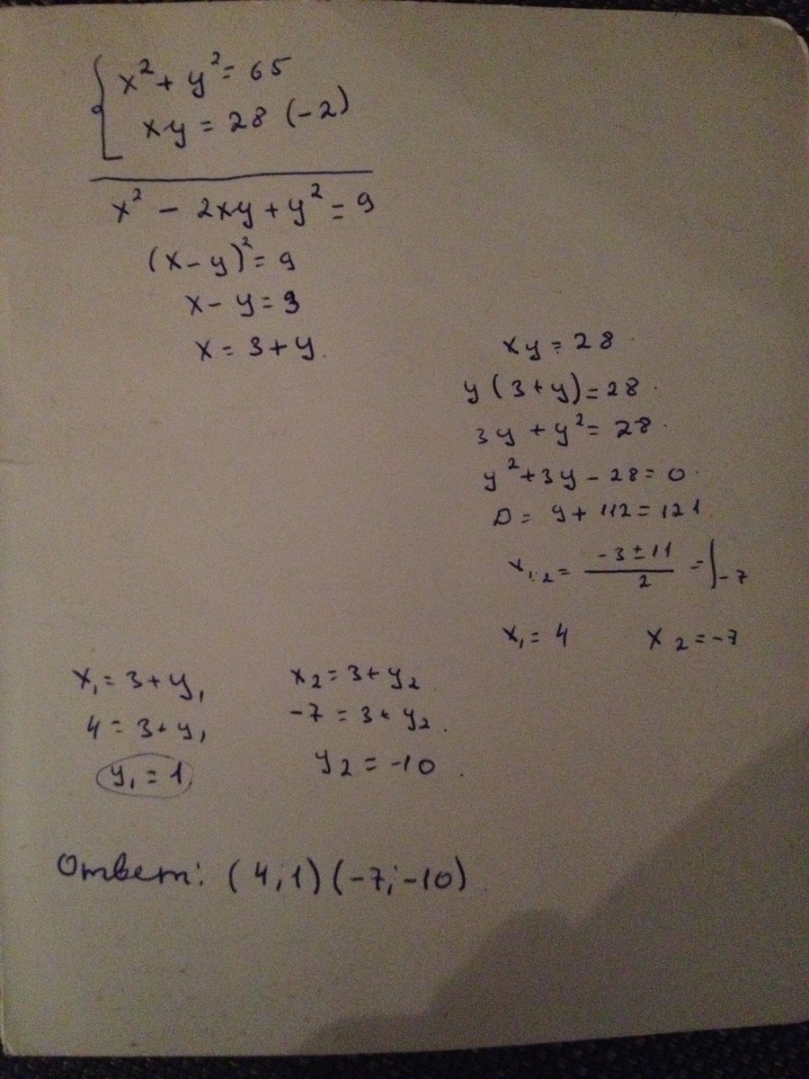 Нет. Ответ такой: (4; 7), (-4; -7), (7; 4), (-7; -4).