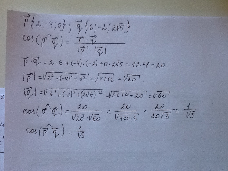 Помогите пажалуйсто,Задание:Даны векторы вектор Р(2;-4;0);вектор q(6;-2;2корень из 5).Найти косинус угла между ними.