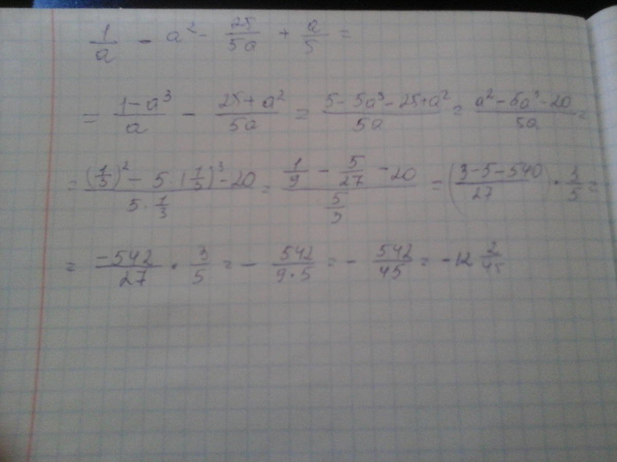 1/а-а^2-25/5а+а/5=1-а^3/а-25+а^2/5а=5-5а^3-25+а^2/5а=а^2-5а^3-20/5а=(1/3)^2-5×(1/3)^3-20/5×1/3=(1/9-5/27-20)/5/3=(3-5-540/27)×3/5=-542/27×3/5=-542/45=-12 2/45