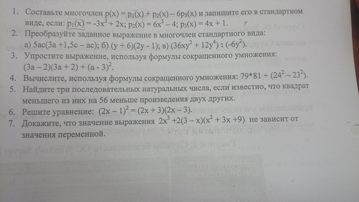 В формулу р(х)=р1(х)+р2(х)-6р3(х) подставим значения р1(х)=-3х^2+2х, р2(х)=6х^2-4, р3(х)=4х+1 и получим следующее: