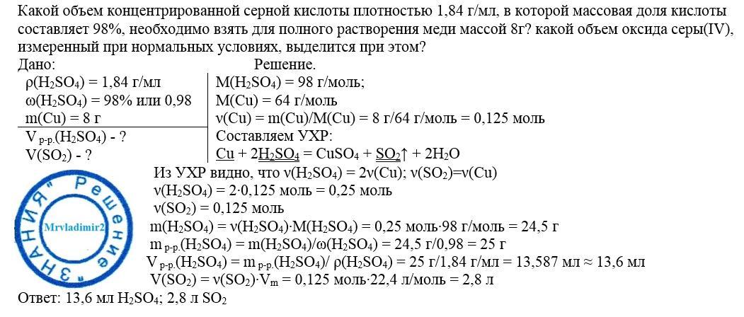 Какой объем концентрированной серной кислоты плотностью 1,84 г/мл, в которой массовая доля кислоты составляет 98%, необходимо взять для полного растворения меди массой 8г? какой объем оксида серы (5), измеренный при нормальных условиях, выделится при этом?