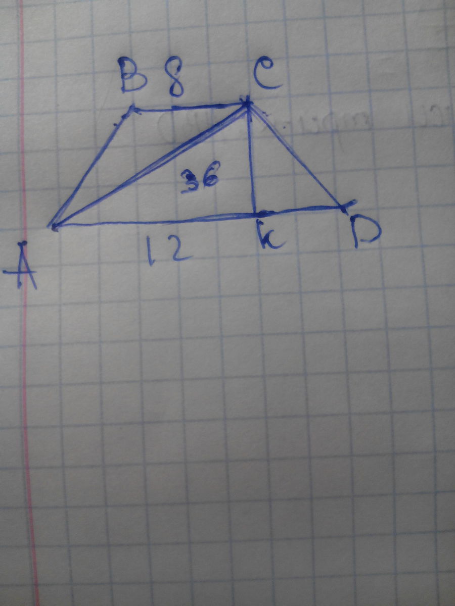 У трапеции ABCD, стороны AD и BC равны 12 и 8дм. Площадь треугольника ACD 36дм. Вычеслите площадь трапеции. Ответ: 60дм.
