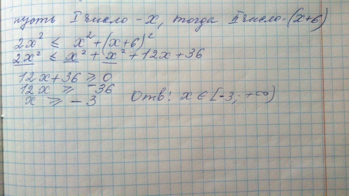 ЗАДАНИЕ A11 С ЦТ- 2014! Даны два числа. Известно, что одно из них меньше другого на 6. Какому условию удовлетворяет меньшее число х, если его удвоенный квадрат не больше суммы квадратов этих чисел?